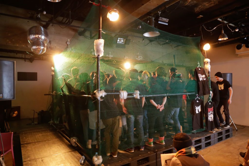 会場には緑色のネットに囲われた立方体状の空間がある。
