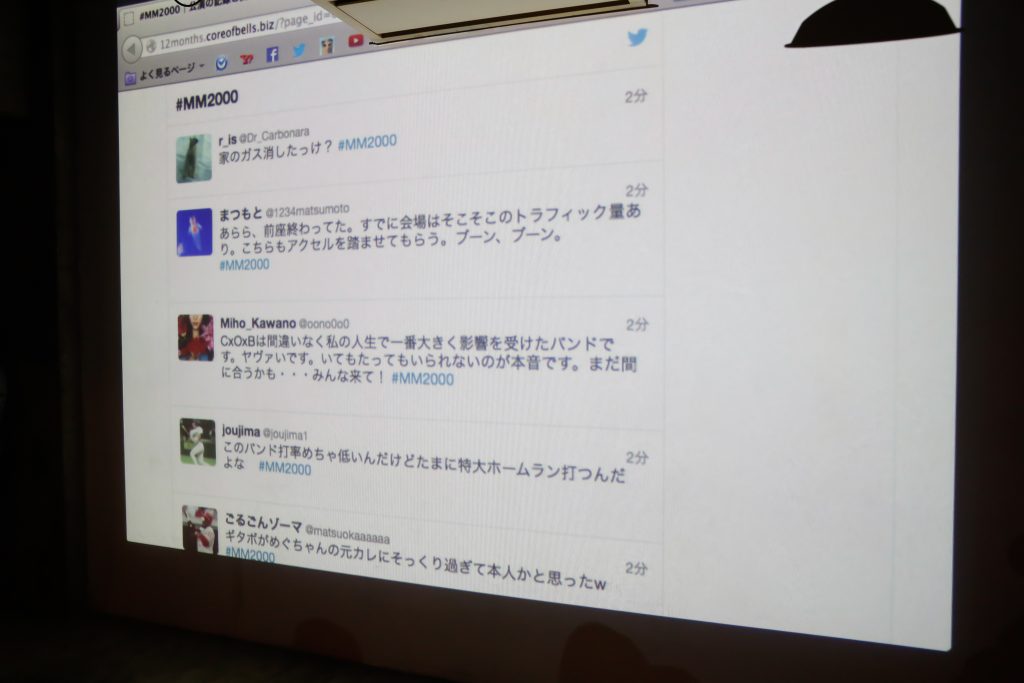 パイプによって枠を組まれた、いかにも仮設といった趣のそれは「檻」とでも言った方がしっくりくるだろう。客席の椅子の並べ方、観客の座っている方向によって、それは観客が観るべき方向、すなわちステージに位置していることがわかる。それはさほど大きくはないが、会場の天井いっぱいに、幅もほぼ客席から見れば視界いっぱいに広がっている。脇に中に入るための小さな入り口があり、その前には棍棒を持ったマッシュルームカットの赤鬼がいる。その「檻」の前方、会場の奥にバンドが演奏すると思われるステージがあることが、ドラム・セットやアンプなどが置いてあることからわかる。つまり、演奏が行なわれるステージは、その「檻」越しに見える位置にある。正確にはどちらもステージ、すなわち舞台に相当する場所にセットされたものである。会場であるスーパーデラックスの空間の大きさから考えて、バンドの演奏すると考えられるエリアは極めて狭いと思われる。くりかえせば、そのエリアと観客のいるフロアの間に先の「檻」が視界いっぱいに設置されている。つまり、テージは極めて見にくい。さらにはフロアの壁にはTwitterのタイムラインがプロジェクターで投影されている。ハッシュタグが設定されているらしい「#mm2000」。ここには開演前から会場の観客による実況がすでに呟かれており、ライヴ中も逐次会場の様子が伝えられるものと思われる。