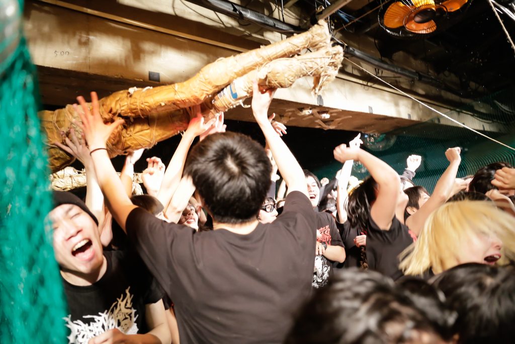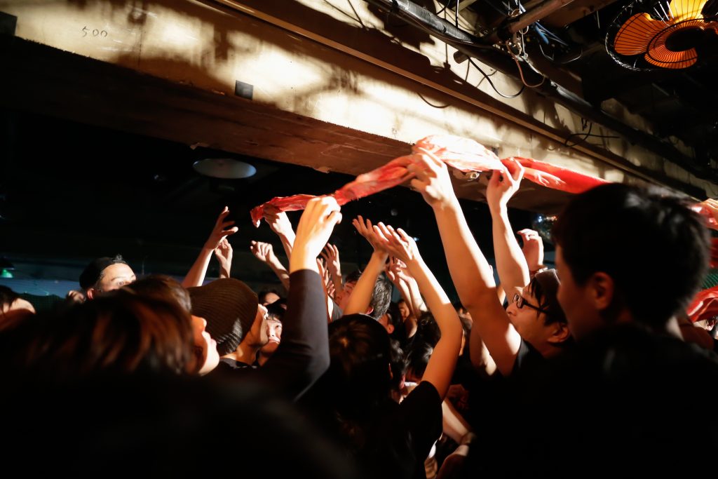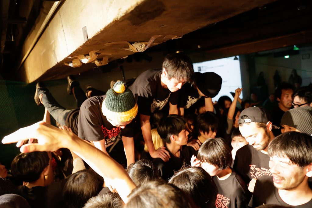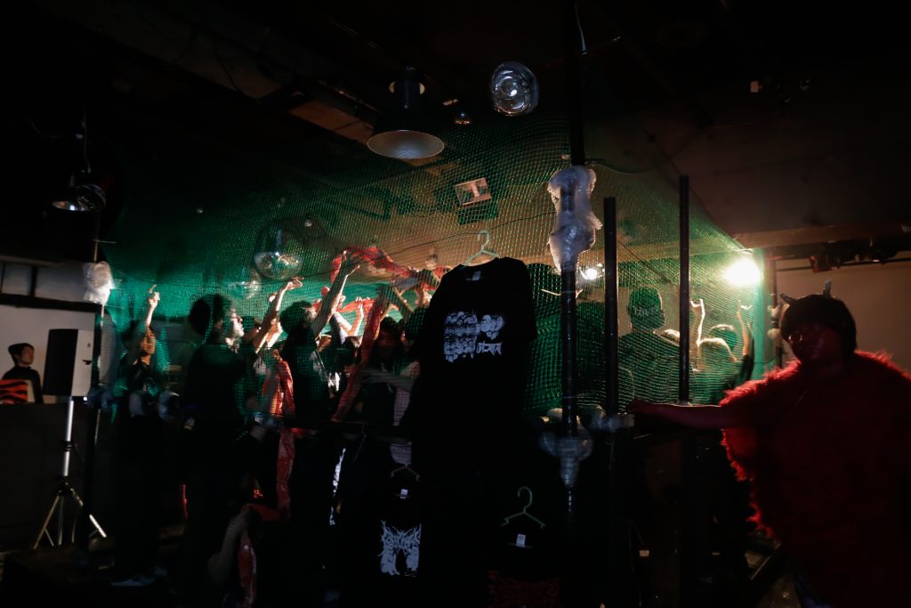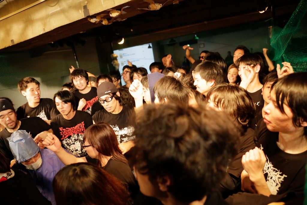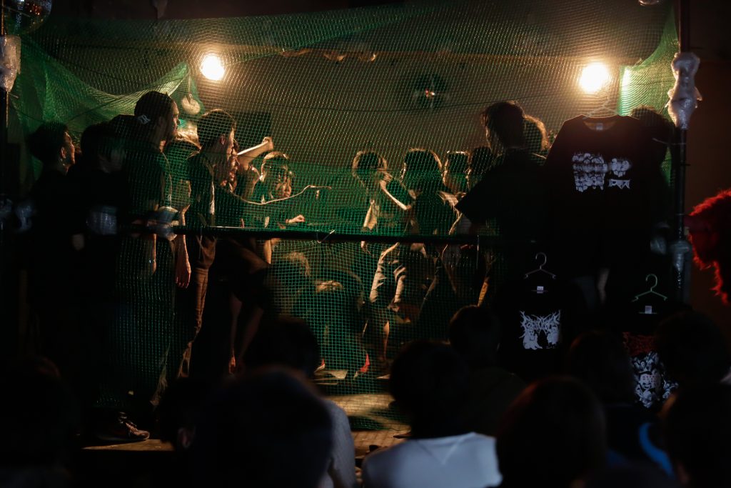 開演前、フロアはいかにもcore of bells(以下COB)のファンといった風情の黒いTシャツを着た若い男女たちであふれていた。それは二重になったフロアだった。大人しく演奏を観ていたい観客は客席後ろで椅子に座っていればよい。より盛り上がりたい向きは、先の「檻」の中に入り、大勢で思い切り体をぶつけあい、汗をかき、モッシュに興じればよい、というわけだ。赤鬼もいるし、私はもちろん客席の後方からステージを見ることにする。そうするうちにフロント・アクトのNEVER END RAINBOWの演奏が始まる。個人的にはヴォーカリストのMCなど、好感度が高く気に入ったが、客席はほとんど盛り上がっていない。本人たちのひたむきさに比べ、残念だが客席の熱量はかなり低いと言わざるを得ない。「檻」の中もガラガラだ。ゆえに、演奏は「檻」の向こうにたしかに確認することができる。そこでは演奏が、たしかに、行なわれている。「檻」の向こうには確実に演奏のためのステージがある。観客も前座の演奏を聞き流すようにして、Twitterに呟いたりしながら、メイン・アクトを待っているようだ。すると、先ほどまでまわりにいたはずの大勢の黒Tシャツの若者たちが、潮が引くようにいなくなり、「檻」の中へとひとりふたりと入って行くではないか。みるみるそこは黒Tシャツの若者たちの充満した、高密度の空間となった。しかも「檻」は、フロアよりやや床があがっているため、人の塊に遮られてステージを観ることもままならない。